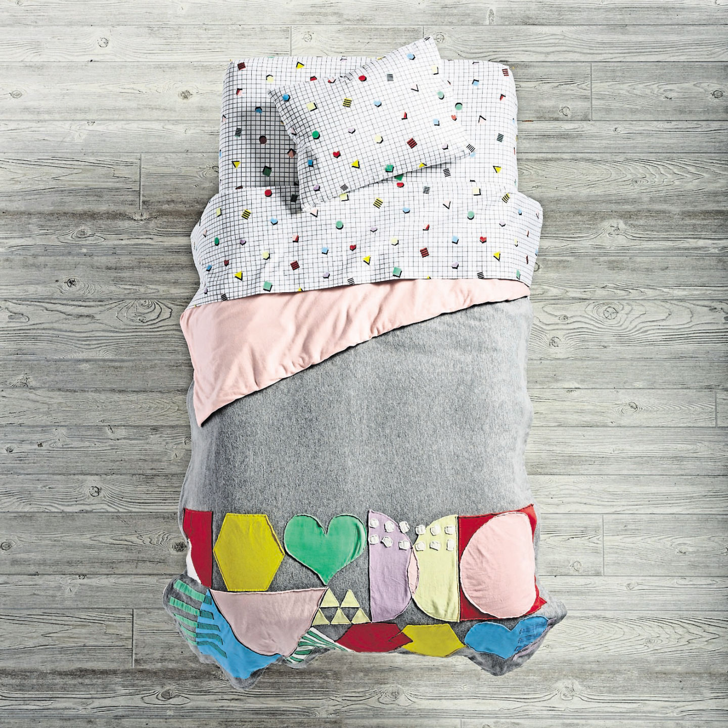 City-based studio Ampersand on a whimsical bedding collection stitched with rainbows and geometrics, in retro color combos like pink, blue, red and turquoise.