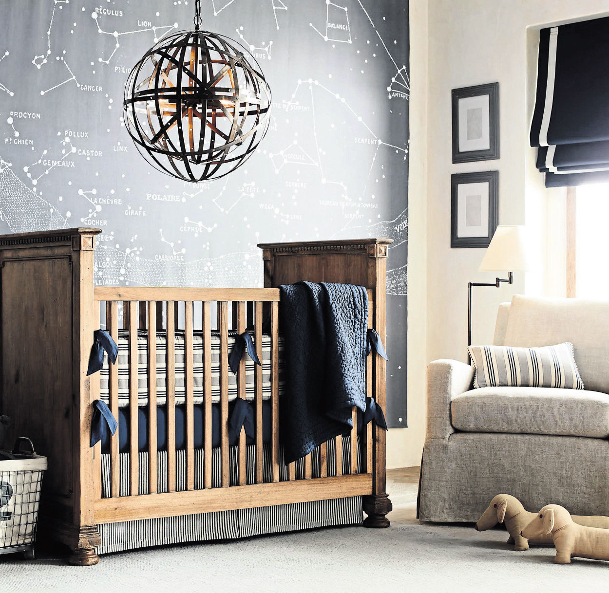 RH Baby & Child’s collection features upholstered cribs resembling wing chairs; conversion kits allow them to be turned into beds down the road. There’s a big selection of chandeliers, too.
